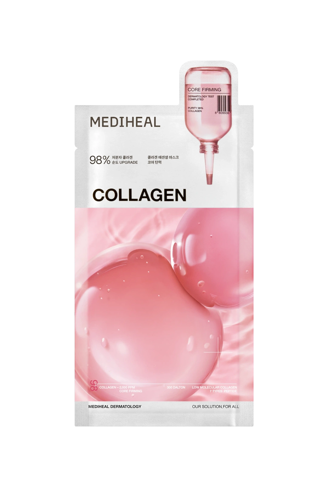 Ujędrniająca maska w płachcie z kolagenem. Skoncentrowana formuła esencji, którą nasączono maskę, została wzbogacona o innowacyjny kompleks składników aktywnych opartych na: hydrolizowanym kolagenie, trehalozie, kwasie hialuronowym, ekstrakcie z pachnotki, ekstrakcie z korzenia mniszka lekarskiego oraz oleju ze słodkich migdałów.
