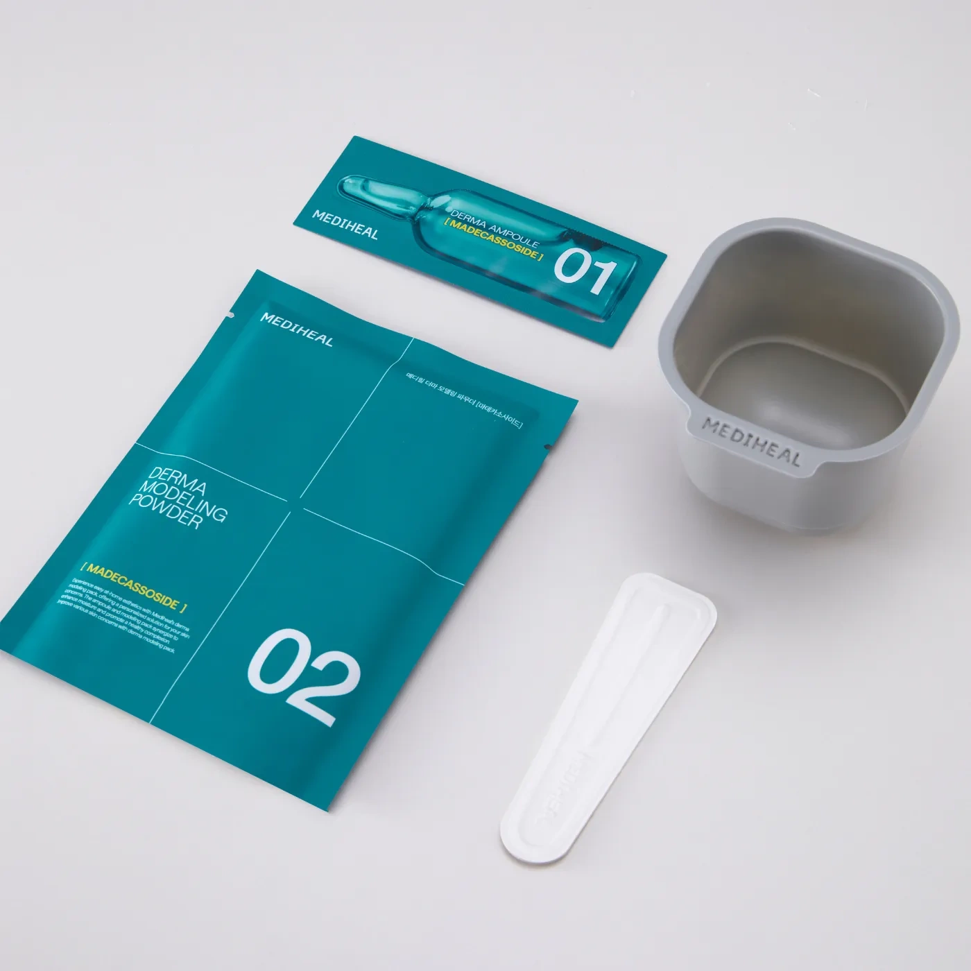 Mediheal Derma Modeling Powder [MADECASSOSIDE]: Diatomaceous Earth, Glucose, Algin, Calcium Sulfate, Kaolin, Trehalose, Betaine, Aqua, Xylitol, Panthenol, Sodium Ben-zoate, Sodium Dehydroacetate, Houttuynia Cordata Powder, Allantoin, Sodium Hyaluronate, Chamaecyparis Obtusa Water, Glycerin, Dextrin, 1,2-Hexanediol, Tetrasodium Pyrophosphate, Centella Asiatica Extract, Gardenia Florida Fruit Extract, Madecassoside, Butylene Glycol, Asiaticoside, Camellia Sinensis Leaf Extract, Houttuynia Cordata Extract, Oryza Sativa (Rice) Bran Extract, Hamamelis Virginiana (Witch Hazel) Extract, Artemisia Princeps Leaf Extract.